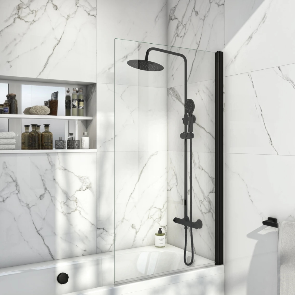 Black Square 900mm Pivot Bath Screen Including Fixed Panel 1500 x 900