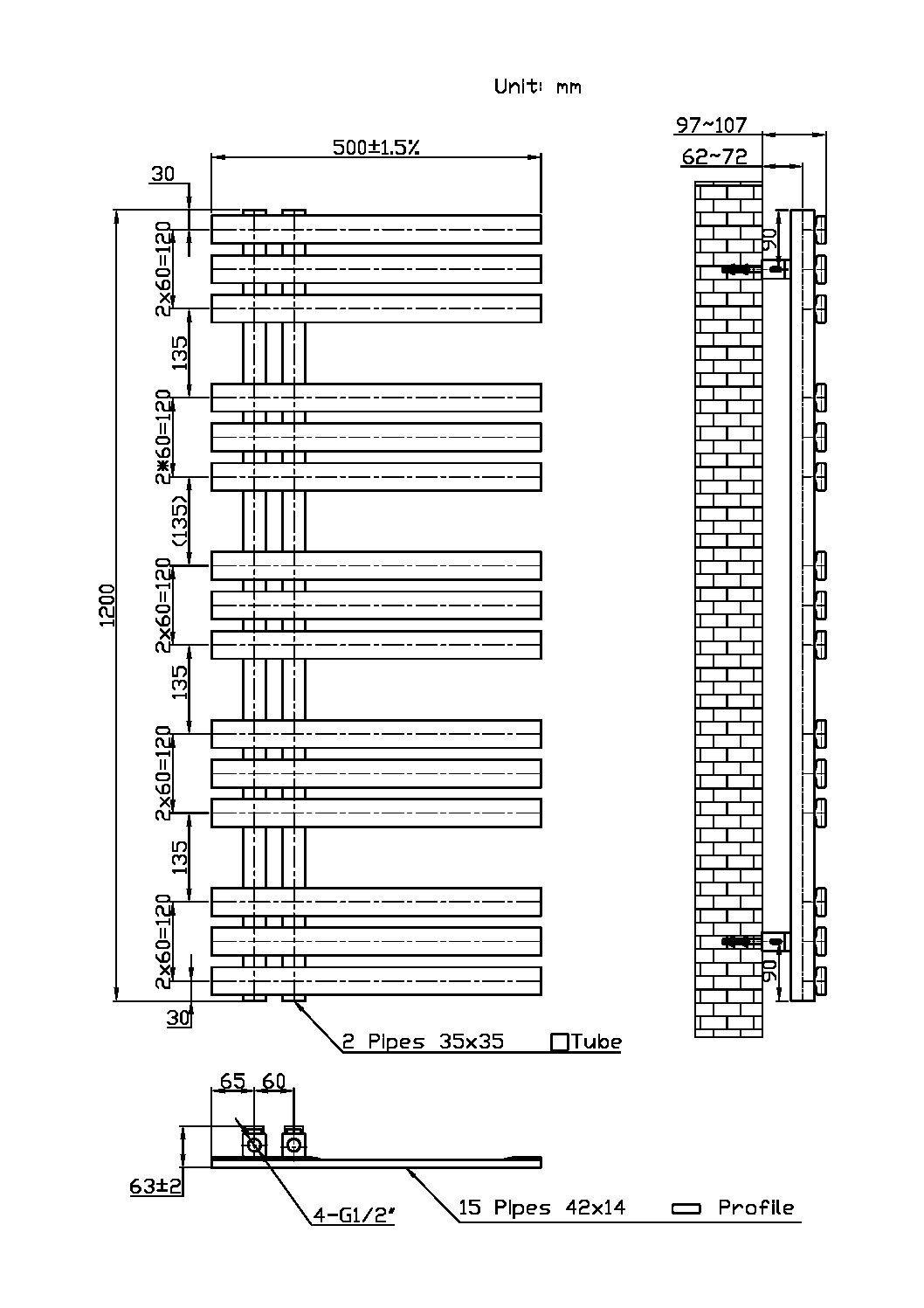 Fixed in structure, the unit supports electric element integration for dual-fuel heating flexibility. Its 1200 mm height suits both compact and mid-sized bathrooms.