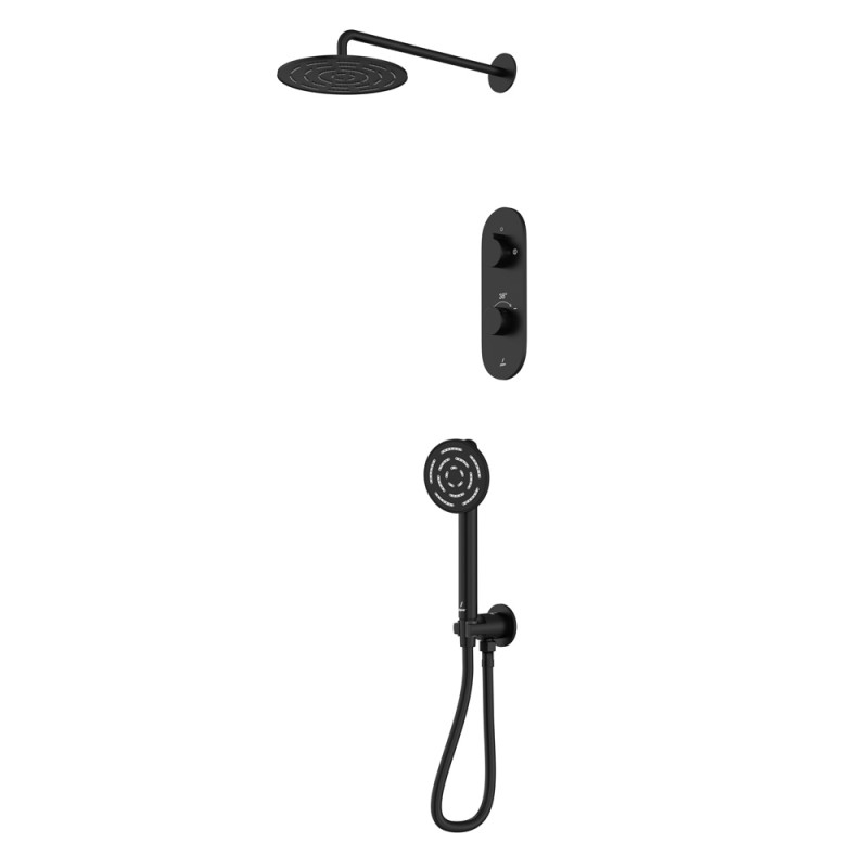 This comprehensive shower system combines the Aquamax Thermostatic Shower Mixer with a 2-way diverter, shower arm, overhead shower, hand shower, shower hose, and wall outlet, providing a luxurious and convenient showering experience. The thermostatic mixer ensures a consistent water temperature, while the 2-way diverter allows for easy switching between the overhead and hand showers.