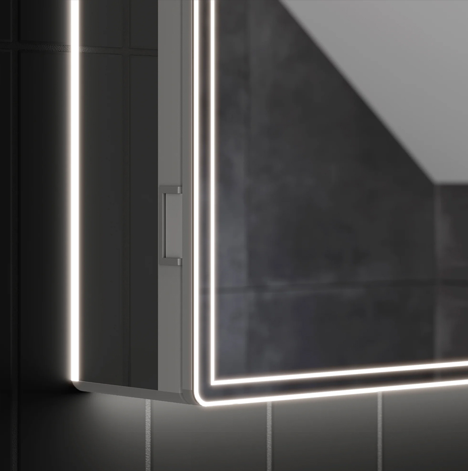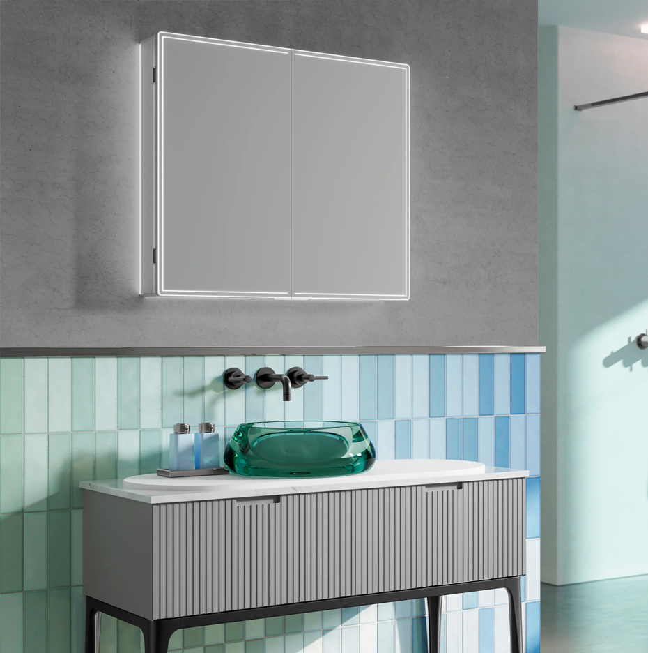 The Isoris cabinet’s frameless design features seamless edges and a high-gloss/matte finish, complementing both modern and traditional bathroom aesthetics. The LED backlighting creates a warm, inviting glow, enhancing ambience without clutter.
