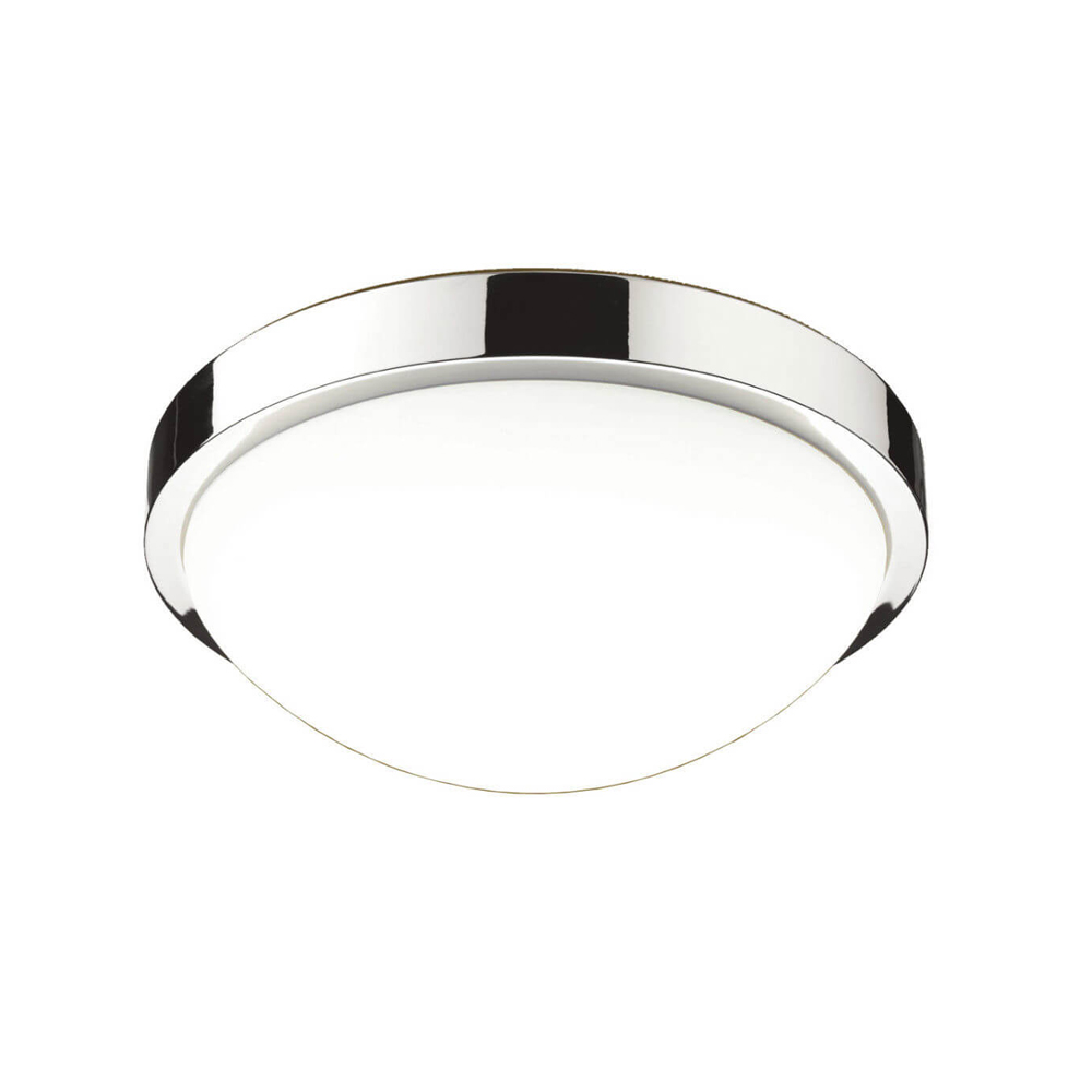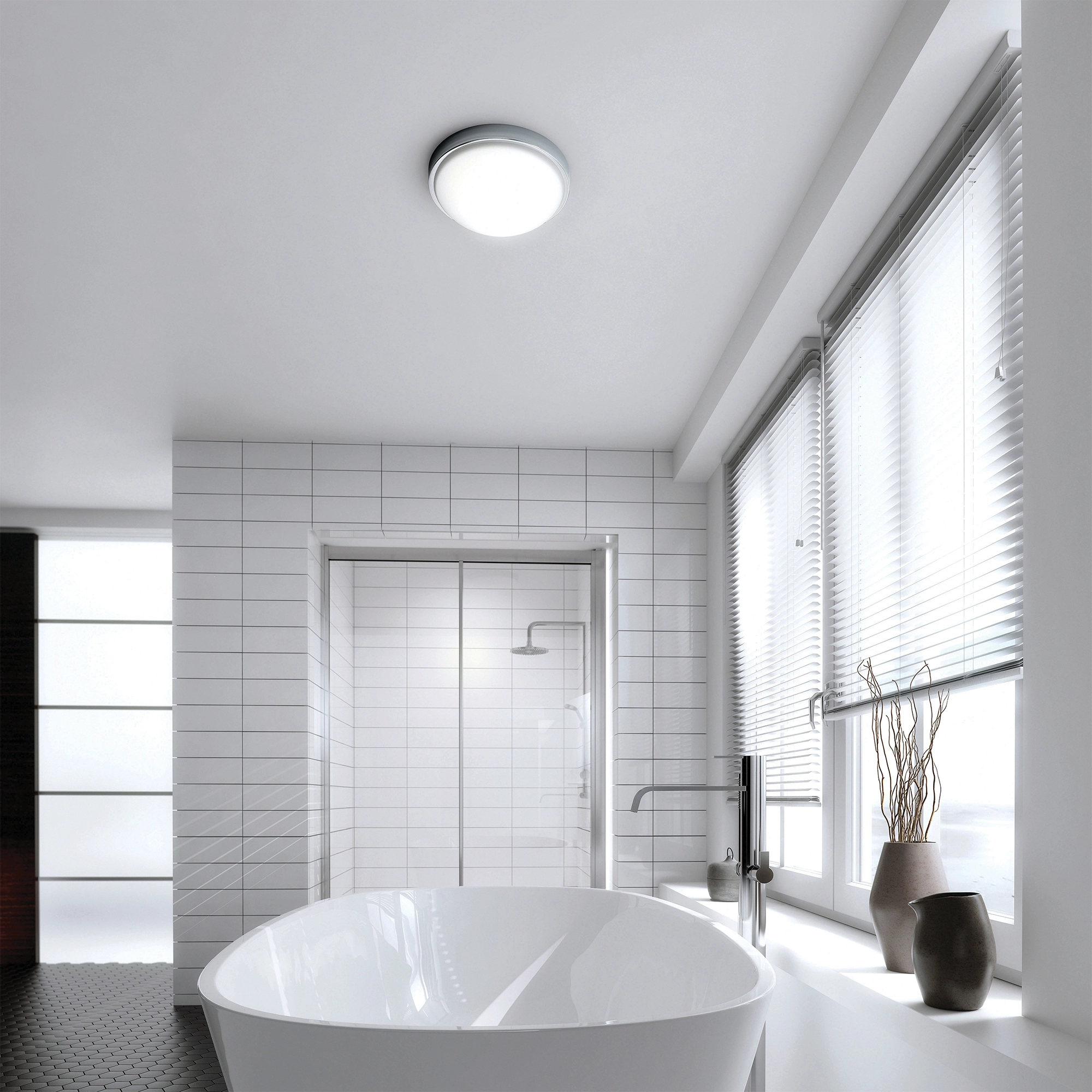 The Kinetic Bluetooth Light features a sleek circular design with a chrome finish that complements modern bathroom styles. Its clean lines and contemporary appearance make it suitable for various interior designs. The opal glass diffuser provides soft, even illumination that enhances the bathroom atmosphere.