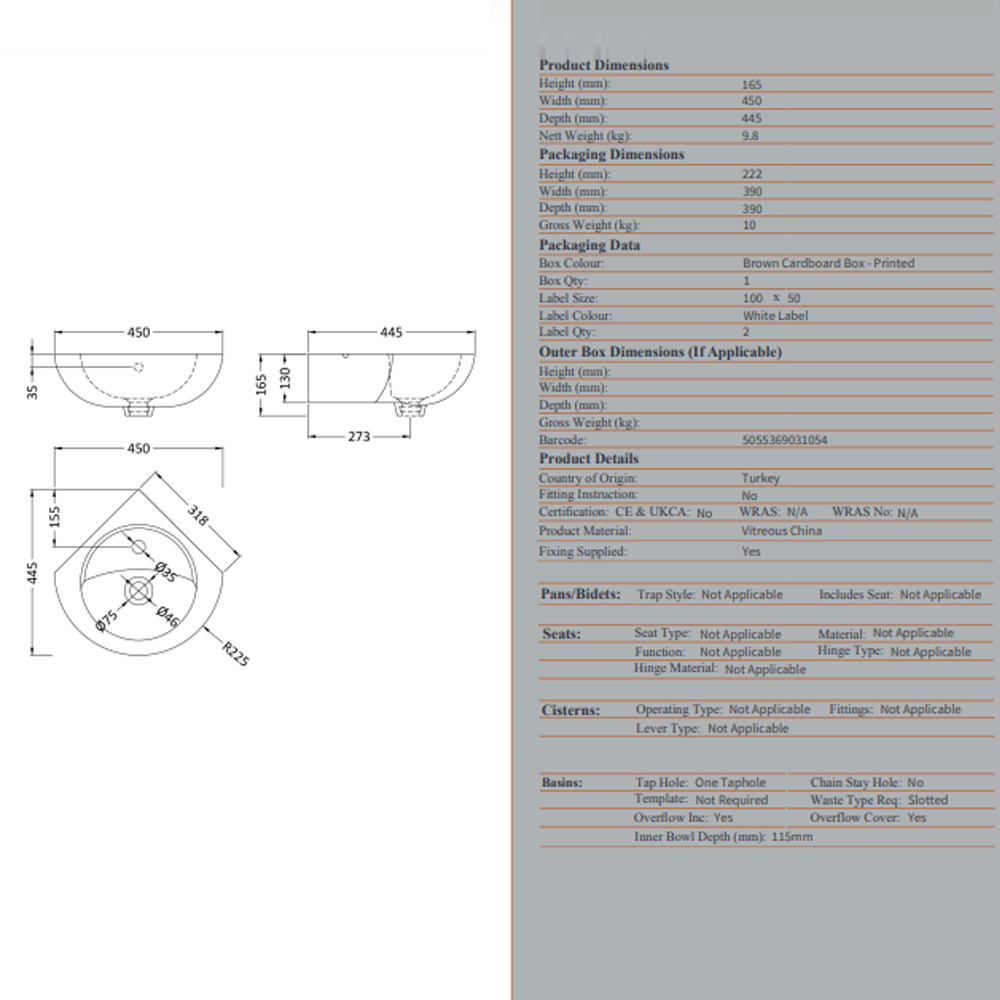 The Melbourne Basin’s compact dimensions (450mm W × 445mm D × 165mm H) and corner-mount design make it ideal for small bathrooms, cloakrooms, or en-suites. The rounded edges and glossy finish add a touch of modernity, while the deep bowl (195mm inner depth) ensures functionality without compromising style.