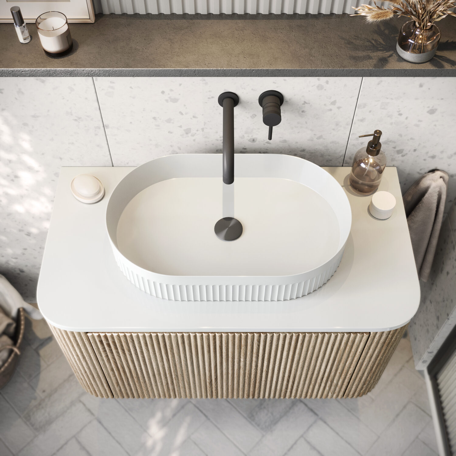 The Orce Fluted Round Countertop Basin delivers a perfect blend of contemporary elegance and refined detailing, making it an ideal centerpiece for any modern bathroom. Its sculpted vertical fluting and round silhouette reflect minimalist design trends while adding a bold texture.