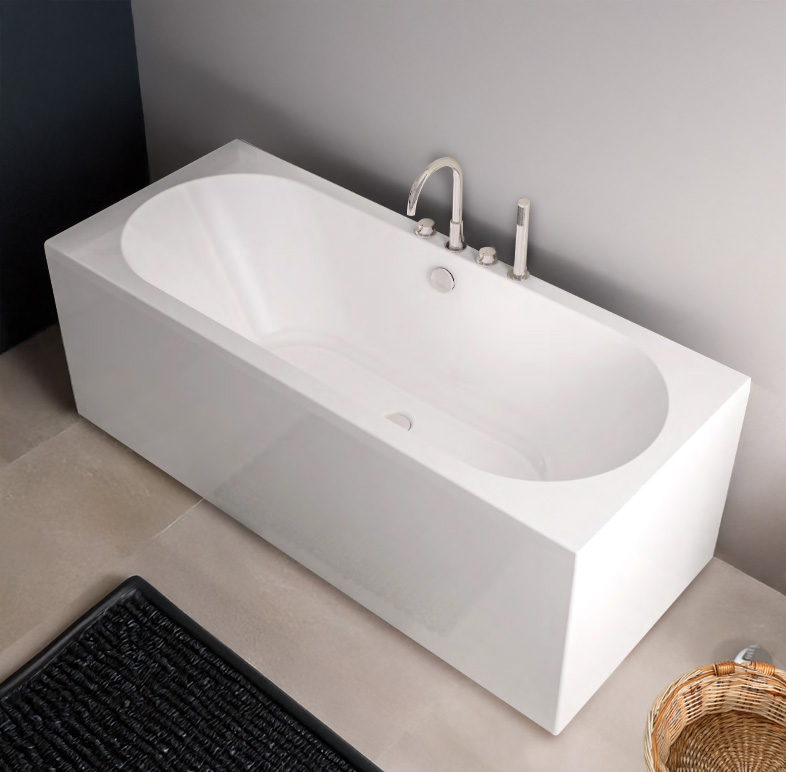This bath’s slim edge profile and square silhouette create a minimalist look, suitable for modern or classic bathrooms. The double-ended design ensures ease of entry/exit and accommodates two bathers comfortably.